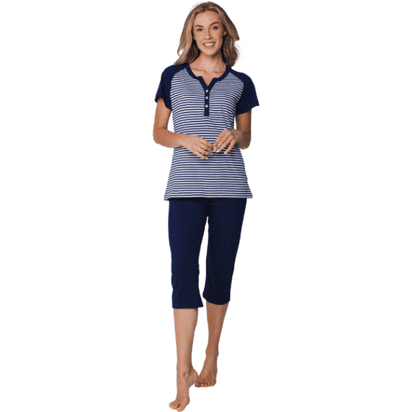Sinivalkoinen pyjama, caprihousut, lyhythihainen paita, 100% puuvillaa