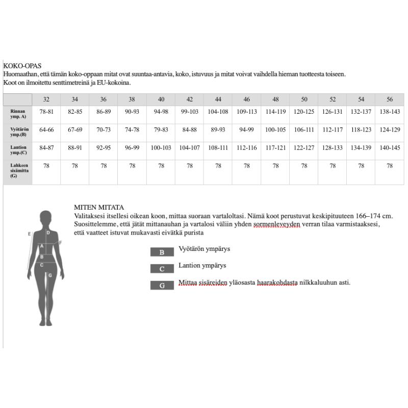 Kapeat lahkeet, helppohoitoinen materiaali ja pituus polven alle. Lahkeen sisäpituus 55cm.