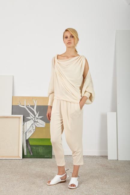 Ioanna Kourbelan ”Archetypes” bolero on valmistettu 100% kreikkalaisesta puuvillalangasta. Hihansuut ovat tiukata, kun taas loput bolerosta peittää vartaloa pehmeästi ja löysästi, jättäen vartalon kaaret näkyviin. Yhden koon bolero on kiva lisä hihattoman vaatteen asusteeksi ja lämmittämään hartioita viileinä päivinä.