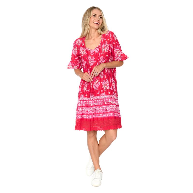 Tämä polvimittainen kesämekko hurmaa raikkaalla punavalkoisella printillään ja kevyen huolettomalla ilmeellään. Pehmeä puuvillakangas tuntuu miellyttävältä ihoa vasten ja hengittää kauniisti lämpiminä päivinä. Kangas laskeutuu rennosti, luoden ilmavan ja naisellisen siluetin.
