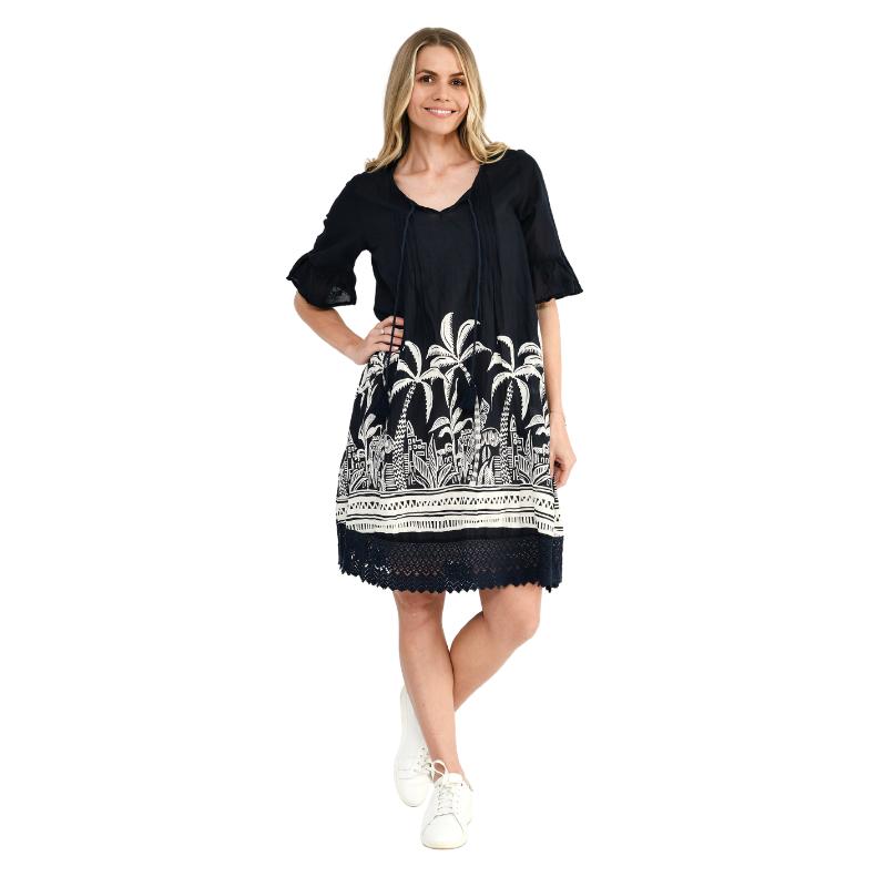 Tämä polvimittainen kesämekko hurmaa tyylikkäällä tummansinisen ja valkoisen yhdistelmällä. Kauniisti kuvioitu helma tuo mekkoon ripauksen kesäistä eleganssia, ja pehmeä puuvillakangas tuntuu miellyttävältä ihoa vasten koko päivän ajan. Materiaali hengittää hyvin ja laskeutuu kevyesti, luoden rennon mutta huolitellun siluetin.
