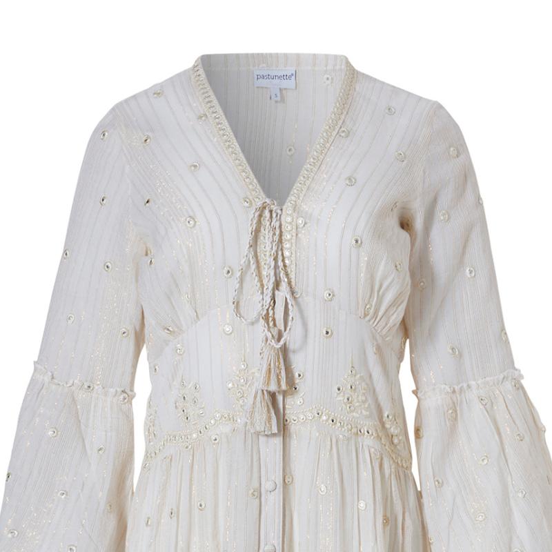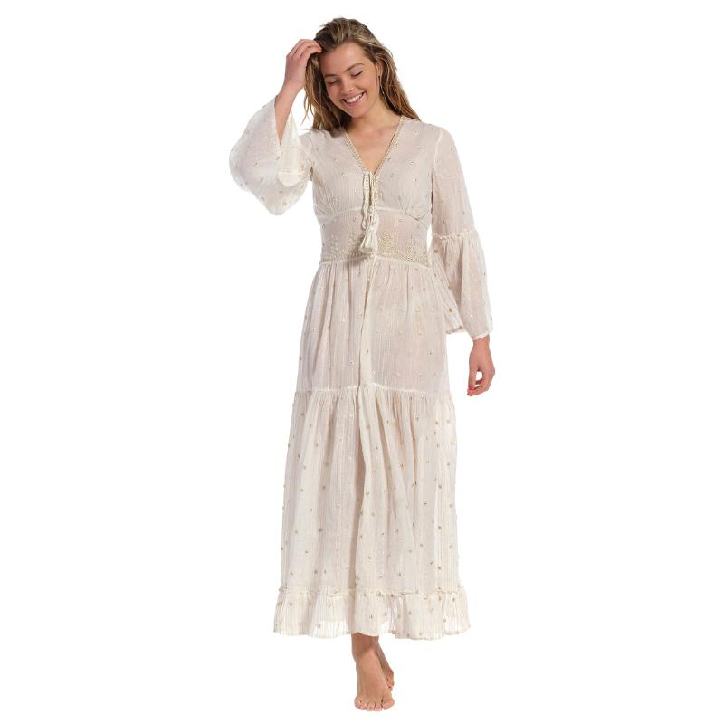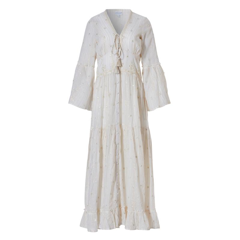 Maksimekko kuin höyhen. Ohut ilmava luonnonvalkoinen puuvilla kirjailtuna pienilläkullanhohtoisilla kirjailuilla. Mekko on rakkautta ensisilmäyksellä. Vaate on vuoriton, joten sen alle on hyvä miettiä jotakin erillistä alusmekkoa. Pue tämä valloittava höyhenen henkäys lämpimänä kesäpäivänä ja tunnet olosi mukavaksi ja viileäksi. Mekko on vartaloa myötäilevä yläosasta vyötärölle saakka. Väljä leikkaus ja frillat antavat helmalle ilmavuutta.