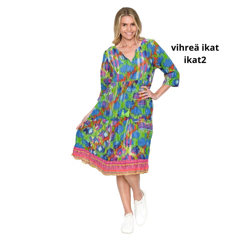 Rebecca hurmaa yksityiskohdillaan – näyttävät printit ja leikkisät tupsuyksityiskohdat tuovat asuun iloa ja persoonallisuutta. Täydellinen valinta niin kaupungille, terassille kuin lomapäivien seikkailuihin.