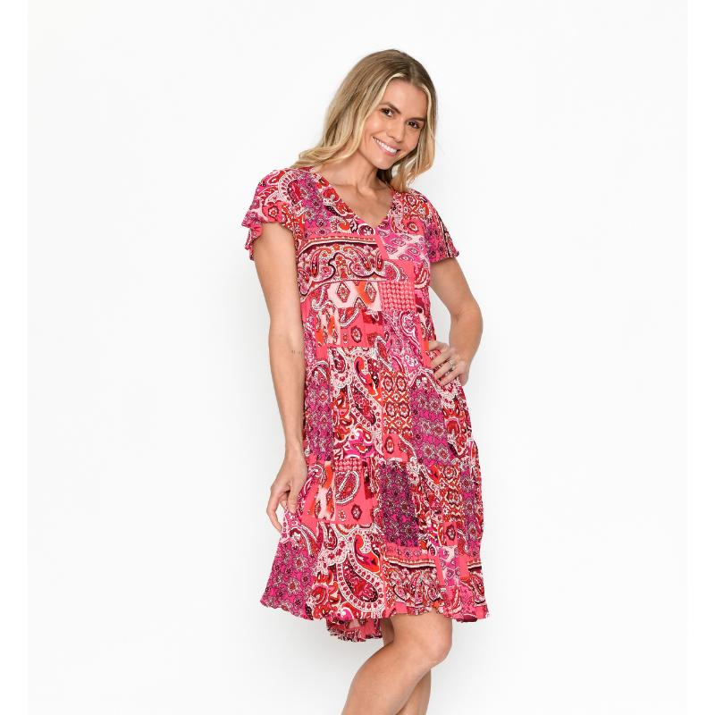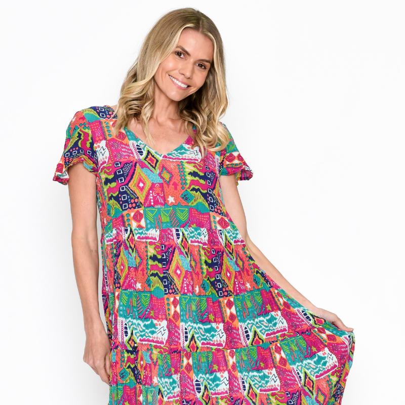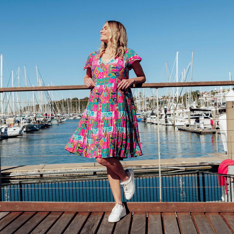 Kimberlyn selkeä V-pääntie, lyhyet cap-hihat ja kauniisti levenevä helma tekevät siitä täydellisen valinnan kesäpäivien menoihin – kaupungille, rannalle tai lomamatkalle. Rypytys rinnan alla luo naisellisen ja imartelevan siluetin.