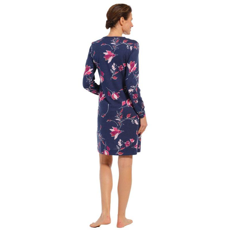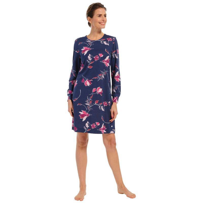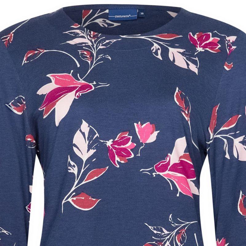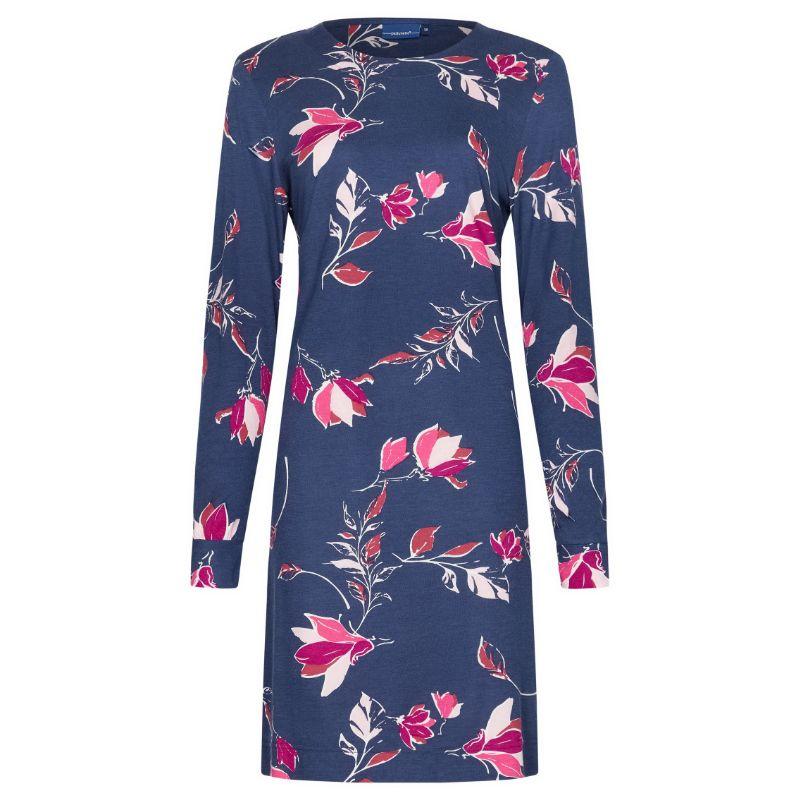 Naisellinen pitkähihainen yöpaita ulottuu mukavasti polveen saakka. Tummansinisellä pohjallapolvelee kaunis kukkakuvio. Pyöreä pääntie on hillityn kokoinen, mutta ei kuitenkaan liian tiukka. Hihansuissa on kivat resorit, joten hihat ei nouse liian ylös yön aikanakaan.
