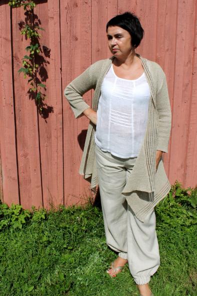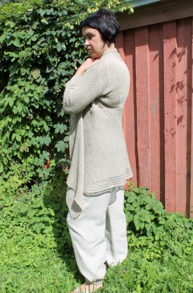 Ihana neule on 100% pellavasta neulottu ja paloista kauniisti ommeltu, edestä auki jäävä takki. Etureunaa korsitaa kevyt pitsimäinen neulos. Tyylikkäänä yksityiskohtana on edestä pidempi helma, joka tuo mukavasti liikettä neuleeseen. Aluksi neule voi tuntua hiukan karhealle iholla, mutta pellavan käyttömukavuus tunnetusti paranee pesujen myötä. Tämä neule sopii niin arkeen kuin juhlaan.