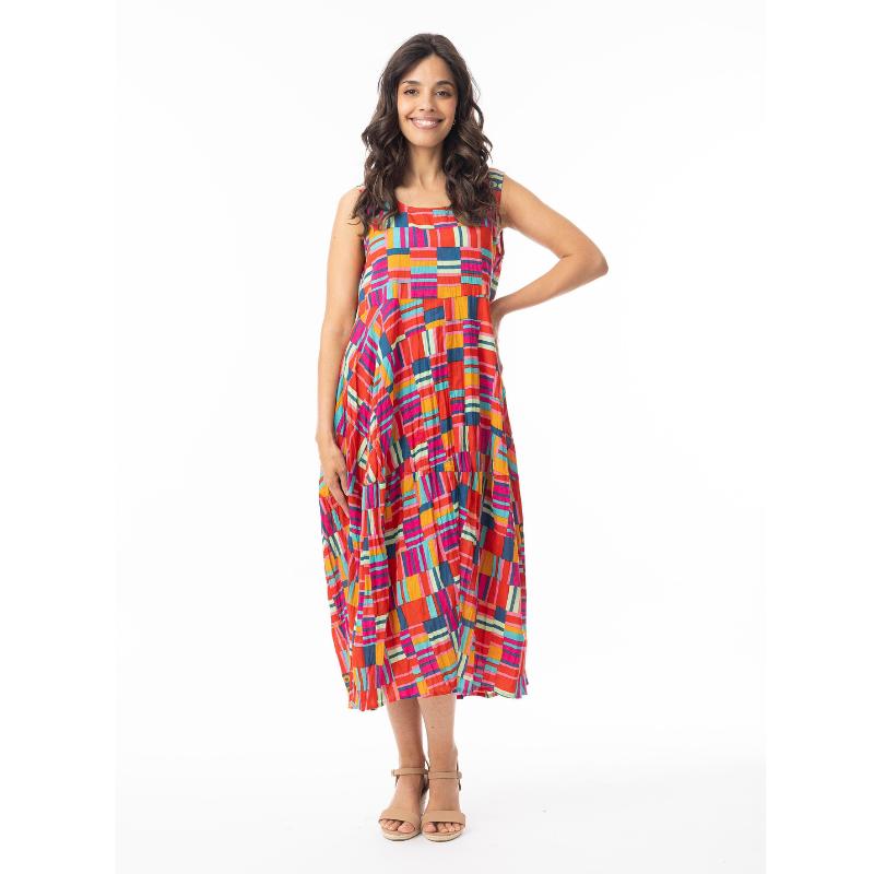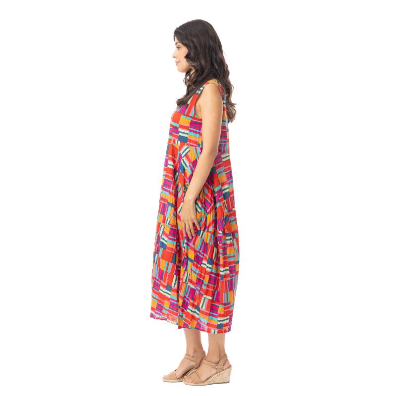 Tämä näyttävä Orientique puuvillamekko hurmaa iloisella ja värikkäällä kuosillaan. Runsas mosaiikkimainen väripinta tekee tästä naisten kesämekosta katseenvangitsijan, joka tuo energiaa kesäpukeutumiseen niin lomalla, rannalla kuin tanssihetkissäkin.