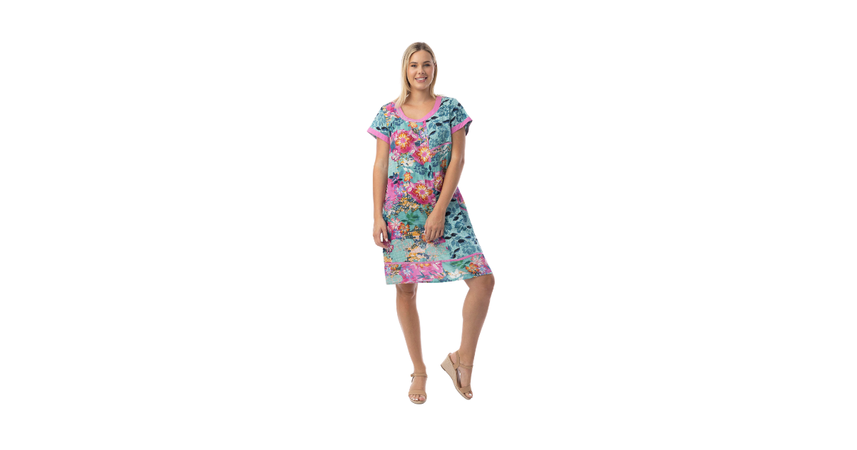 Tämä viehättävä Orientique puuvillamekko tuo kesäpukeutumiseen raikkautta ja väriä. Kaunis kukkakuosi sinivihreän ja pinkin sävyissä tekee tästä naisten kesämekosta iloisen mutta huolitellun valinnan arkeen, lomalle ja rantapäiviin.