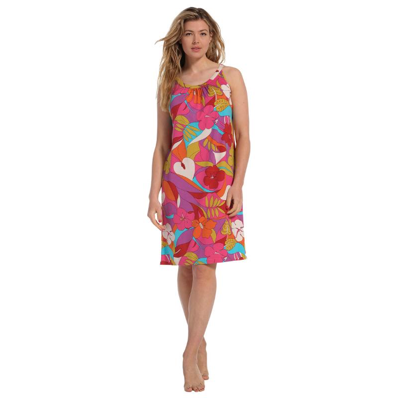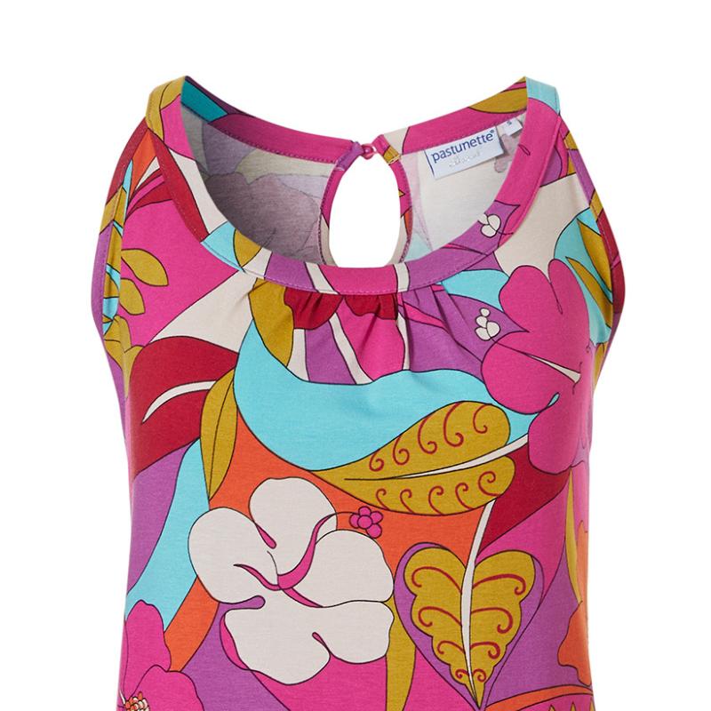 Kaunis ja helppo trikoomekon pääntien tere jatkuu ohuiksi olkaimiksi. Takana päänteillä pukemista helpottaa nappi. Olkain on lyhyt, joten kädentie asettuu kauniisti. Tässä trikoomekossa ympäröit itsesi energisiin väreihin.