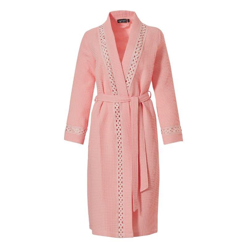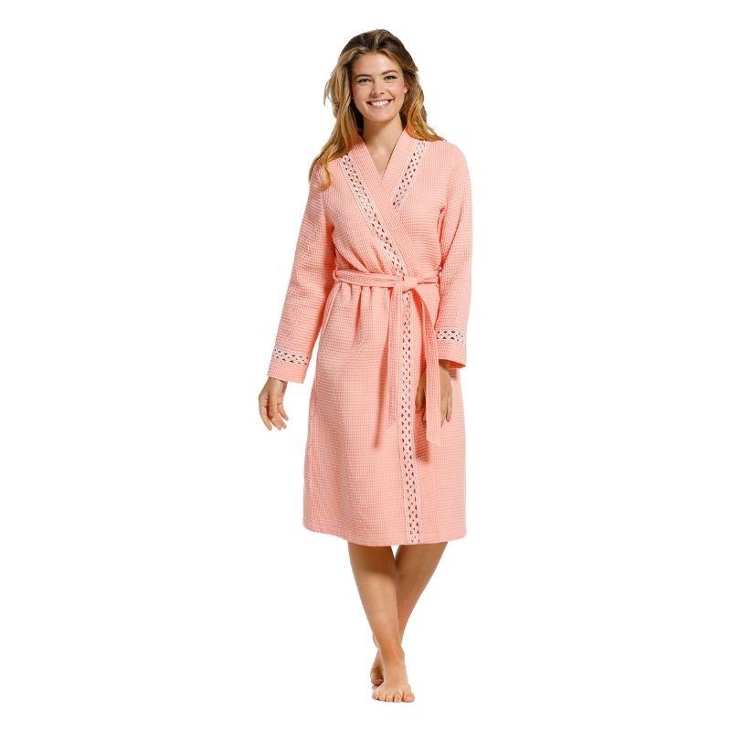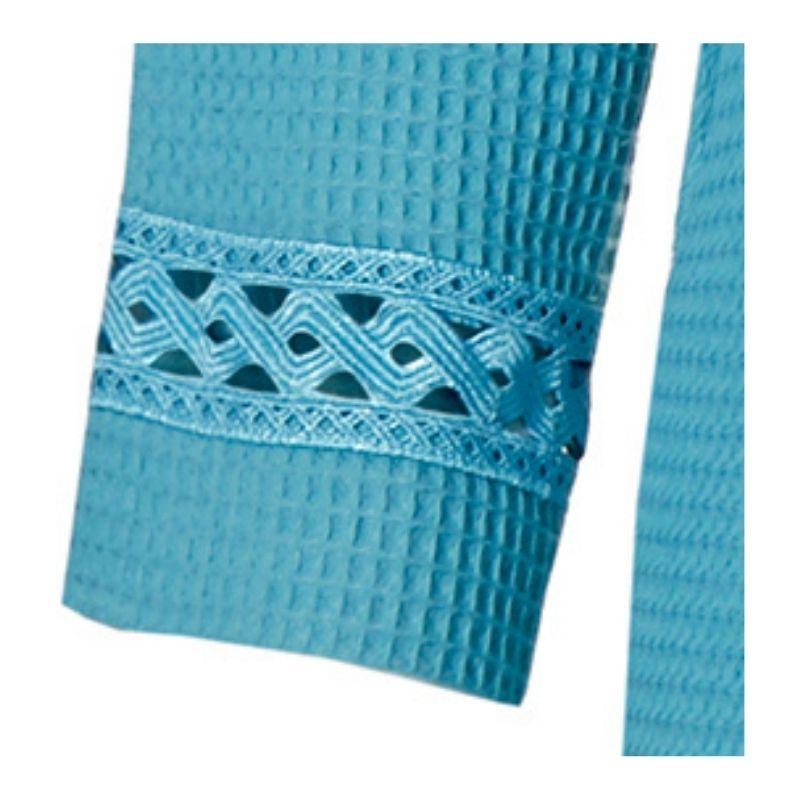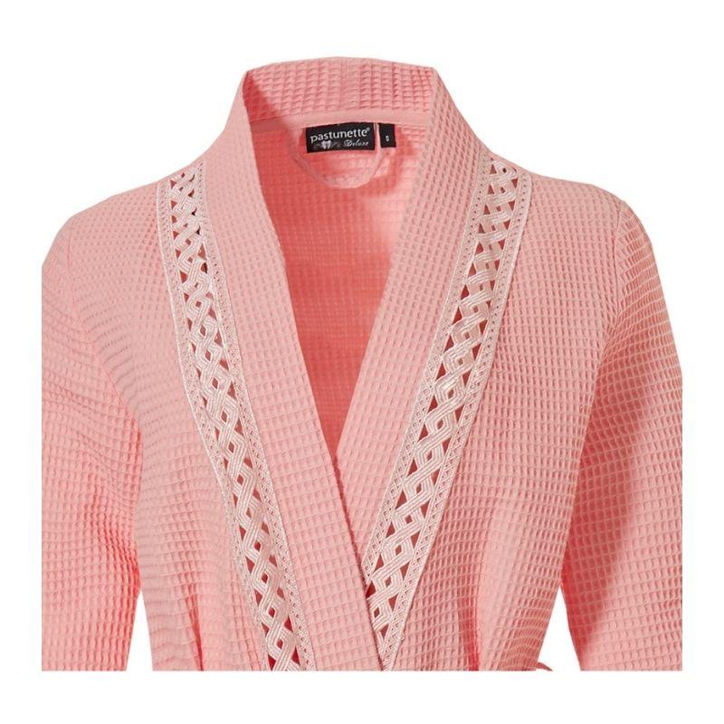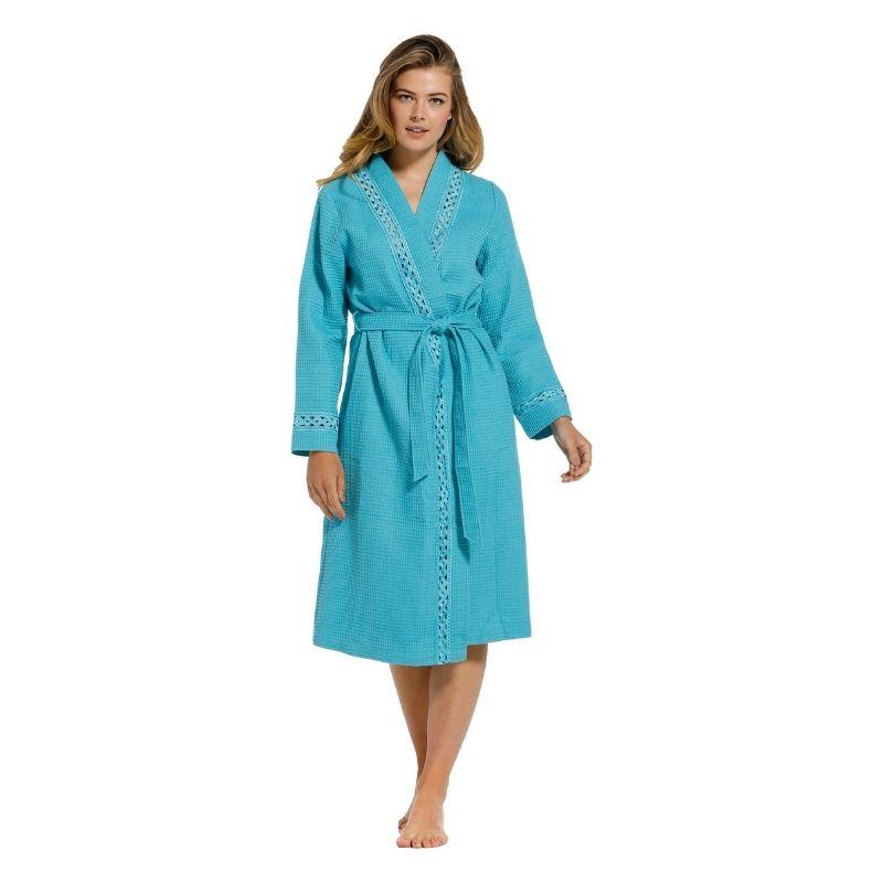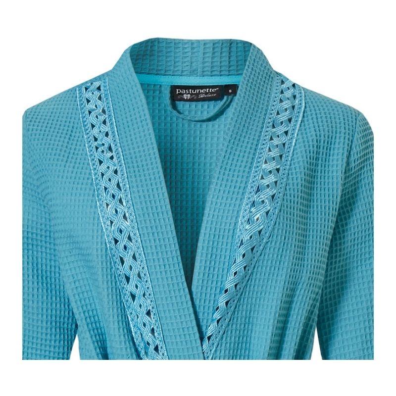 Aamu- tai kylpytakki on kerrassaan mukavaa, ohutta vohvelikangasta. Päänteillä ja hihansuissa kiertää romanttinen hiukan kiiltävä pitsi. Takki sidotaan vyöllä ja sisimmäisen etukappaleen voit solmia ohuella satiininauhalla vastakkaisen sivusauman nauhaan, jolloin kylpytakki pysyy siististi ja vaivattomasti päällä. Paras kylpytakki saunailtoihin, ei hiosta, imee jälkikuumat iholta.