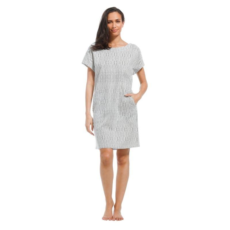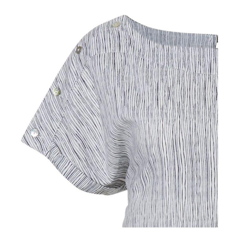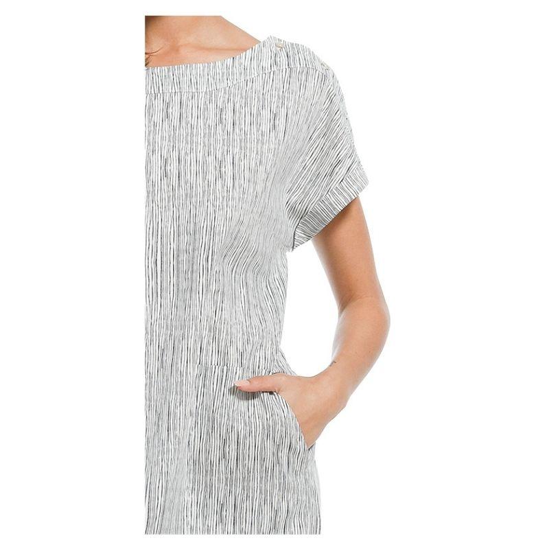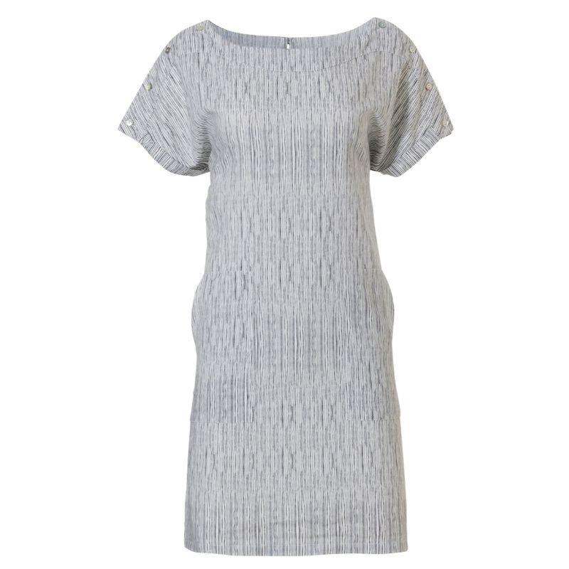 Mekossa on jatketut olkapäät joista muodostuu pienet pukevat hihat. Olkapäillä on muutoin selkeän mekon yksityiskohtana nappikiinnitys. Napit antavat mahdollisuuden säädellä helposti miehustan pituutta omalle vartalolle sopivaksi. Sivusaumoissa molemmin puolin on taskut. Pellavaisen mekon pituus on 95cm.