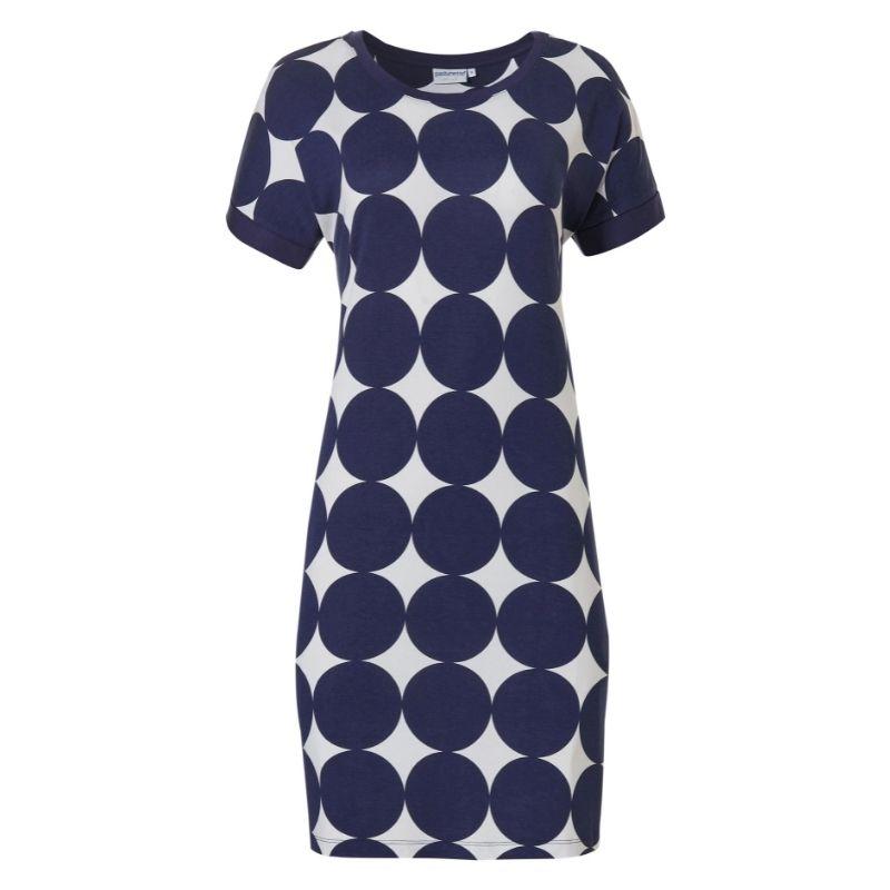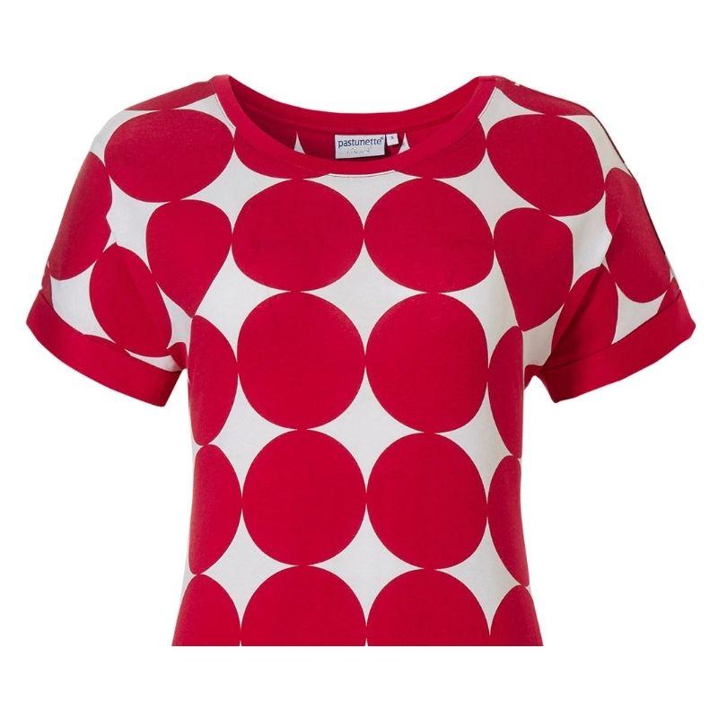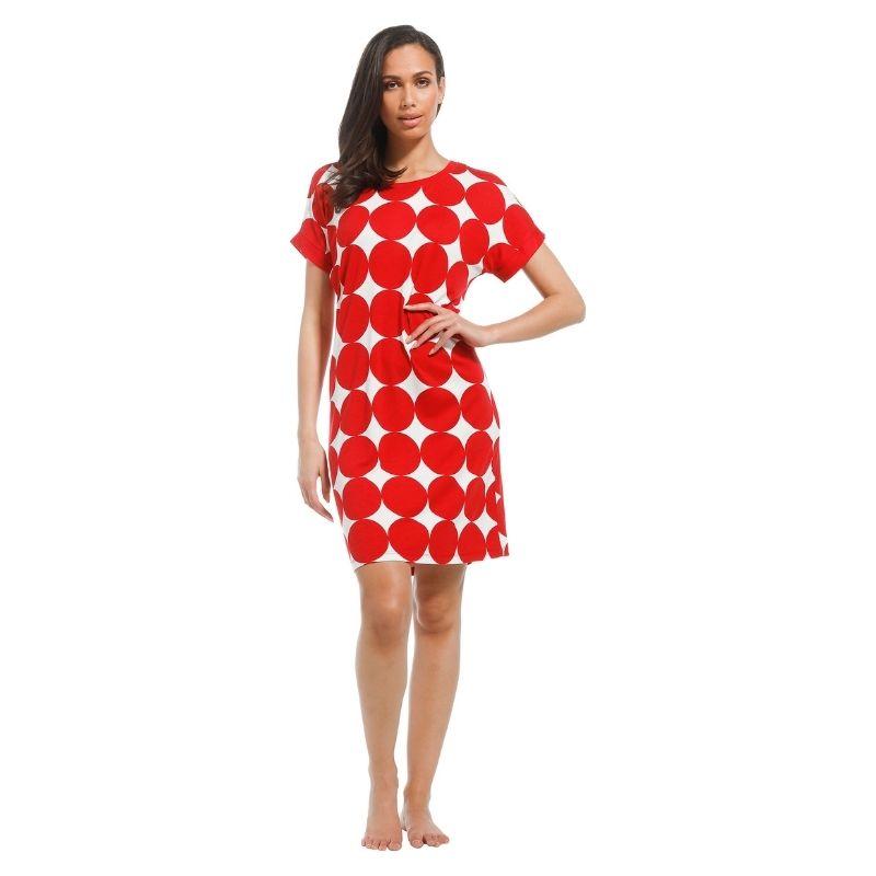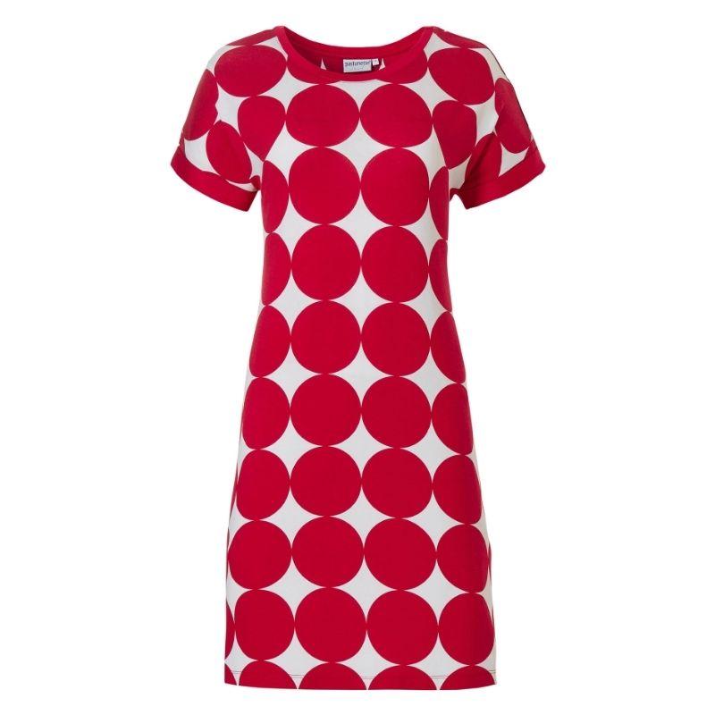 Laskeutuva, ihana, vilpoinen, lyhyt hihainen mekko, on viskoositrikoota. Punavalko- tai sinivalkopallollinen viskoositrikoo on helppohoitoinen ja sopii moneen hetkeen käytettäväksi. Rantamekon pituus on 95cm. Mekko sujahtaa kivasti päällä ja on pehmeä käyttövaate.