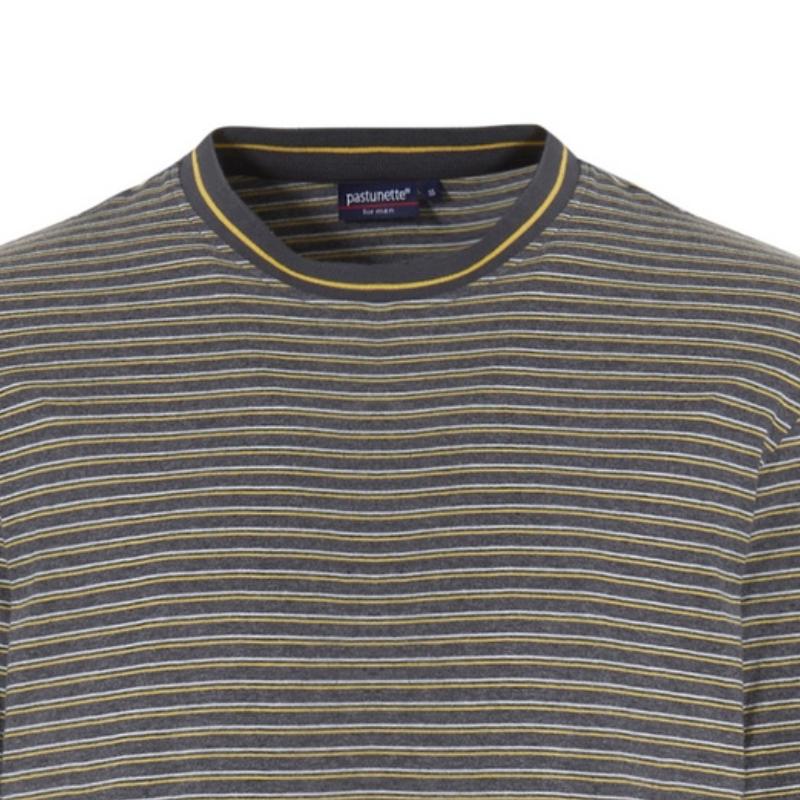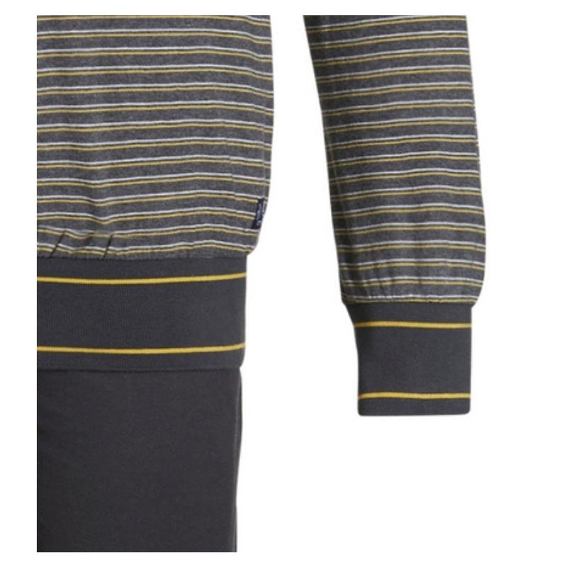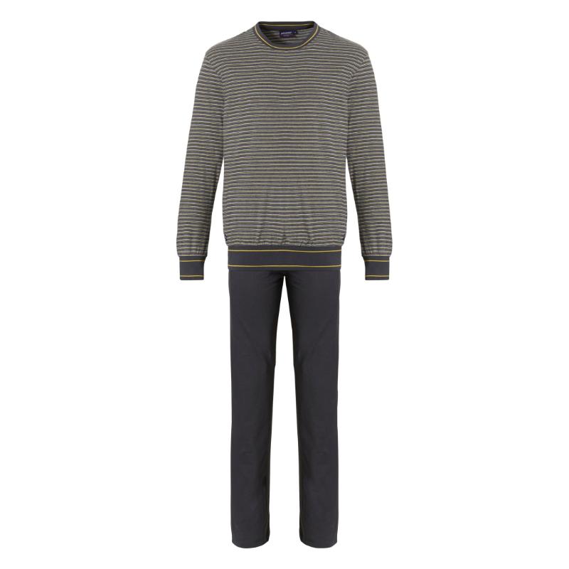 Pyjamassa onharmaat yksiväriset housut ja harmaaraidallinen paita.