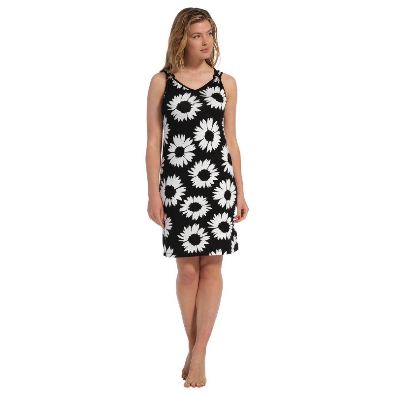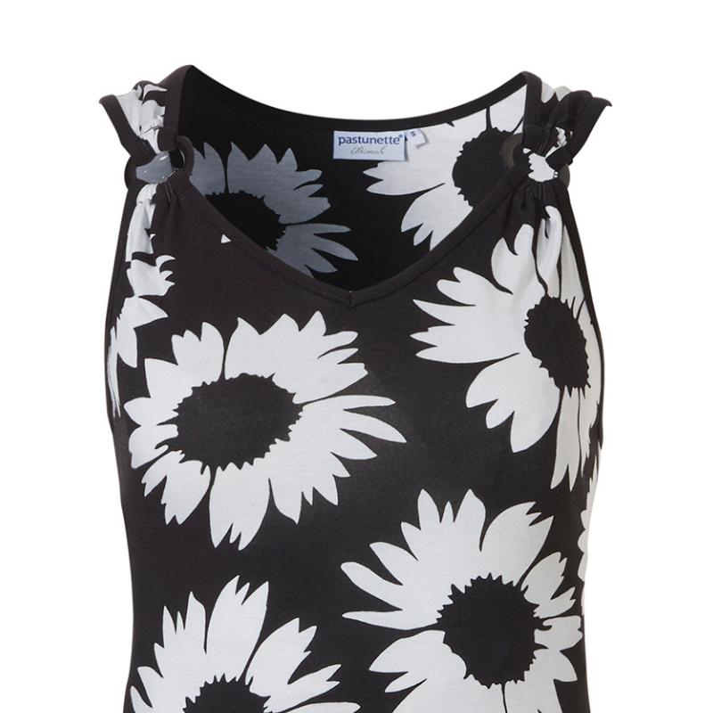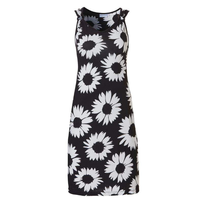 Laskeutuva, ohut, vilpoinen, hihaton mekko on helppohoitoinen ja sopii moneen hetkeen käytettäväksi. Kaunis mustavalkoinen kukkakuosinen mekko/ rantamekko on yksinkertaisuudessaan hauska kesävaate. Olkaimissa etukappaleella on kiva muovinen rengas keventämässä yleisilmettä.