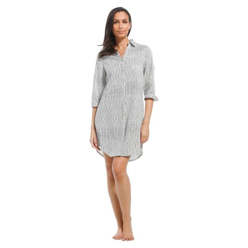 Paitamekon miehustassa on napitus koko matkalta ja paitapuserokaulus. Mekossa on pitkät, istutetut hihat ja hihojen suissa nappikiinnitys. Hihat saat nostettua napilla ylemmäksi. Pellavaisen paitamekon pituus on 95cm.