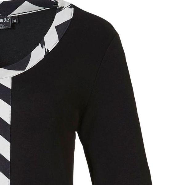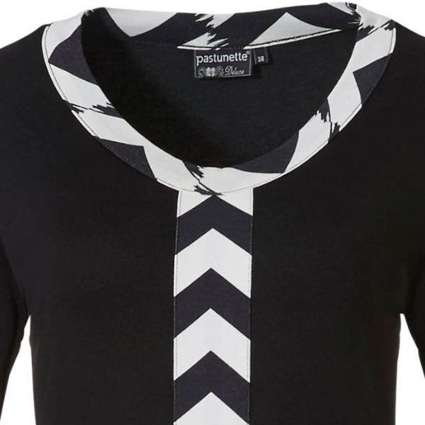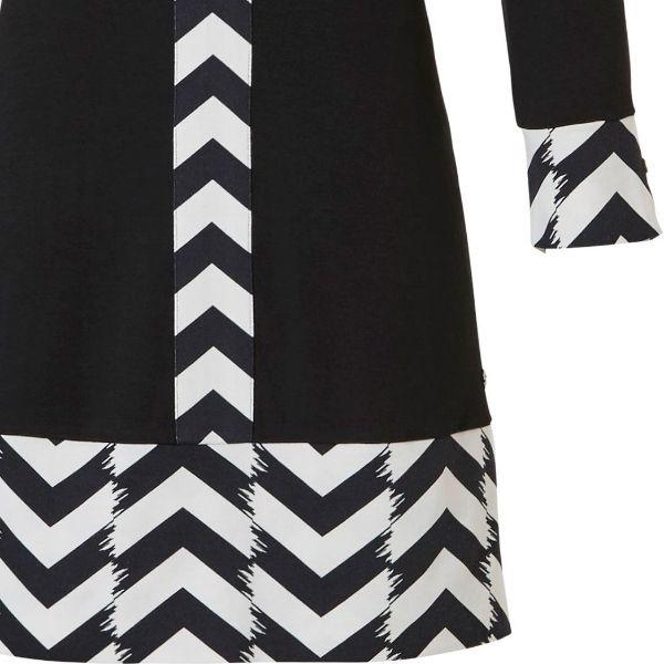 Kauniin hillitysti mustavalkokuviollinen yöpaita. Napakan trikookankaan vuoksi pitkähihainen mekko, toimii myös kotiasuna, tai vaikka rentona mekkona leggingsien kanssa. Yöpaidan alareunassa sekä hihansuissa on kiva leveämpi käänne halkioilla. .