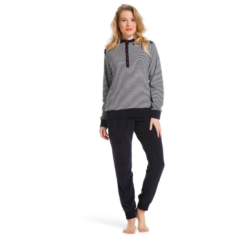 Pyjama – ihanan pehmeä ja lämmin, kankaan ulkopinta froteeta, sisäpinta ihoa vasten on sileä. Paidassa on nappikiinnitys. Housuissa kuminauhavyötärö ja resorit lahkeen suissa. Mitoitukseltaan pyjama vastaa hyvin suomalaiseen mitoituksen.