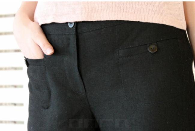 Housut ovat 100% pellavaa. Suora lahje tekee housuista monikäyttööiset. Pellavahousujen vyötäröllä on vyörtärökaitale ja selkäpuolella kuminauha, jolla voi helposti säätää housujen istuvuuden. Edessä vyötäröllä on nappi ja vetoketju. Housuissa on napeilla kiinnitettävät pienet, hauskat, sivutaskut.