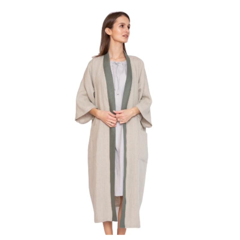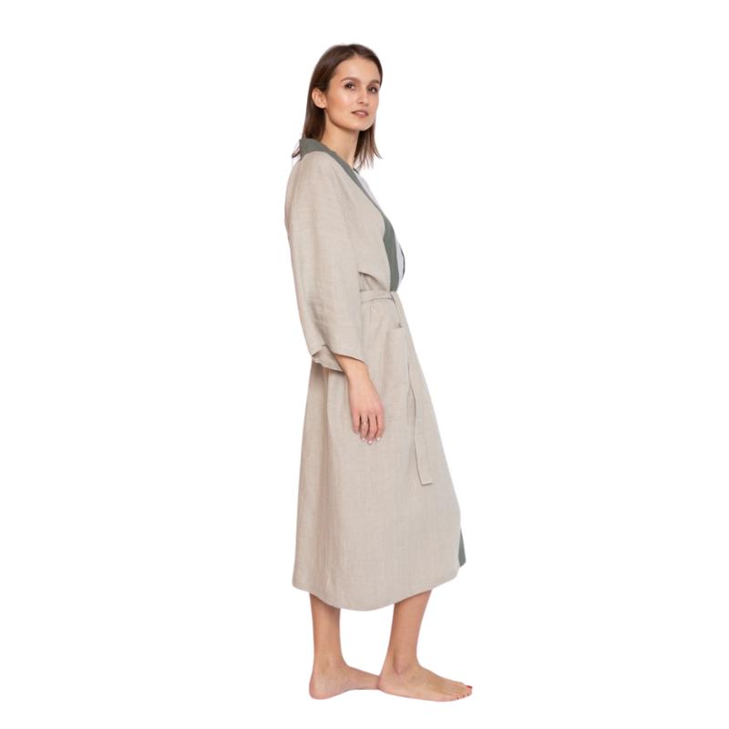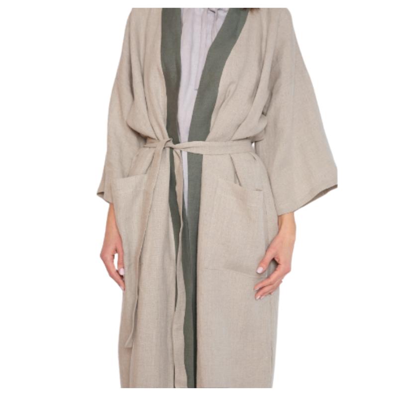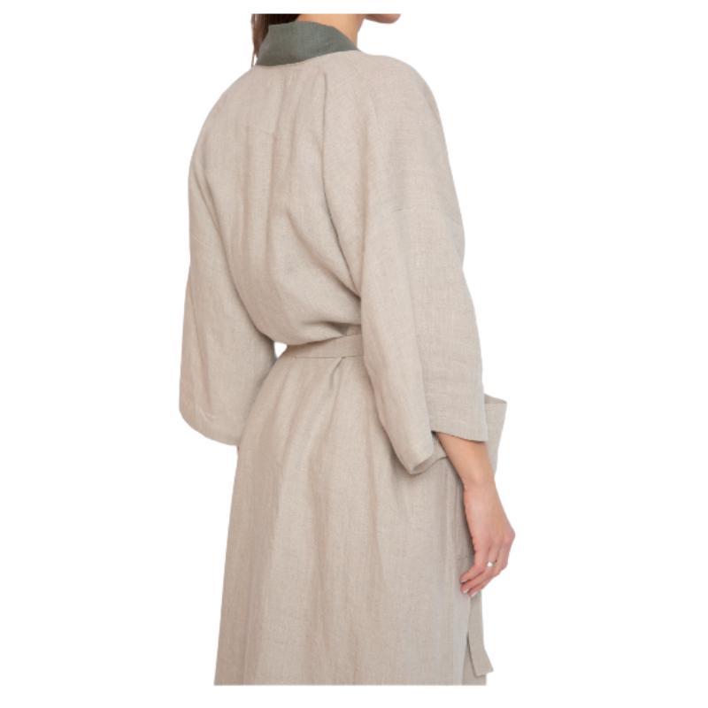 Ihanan rento ja reilu kylpytakki 100 % luonnon väristä pellavaa somistetuna vihreällä tai mustalla tereellä, joka reunustaa pääntietä ja etureunaa. Malli sopii naisille mutta myös miehille. Klassisen kauniissa mallissa on vyötäröllä solmimisvyö ja sivutaskut. Kylpytakin pituus on noin säärien puoliväliin mallissa on mukavan reilut hihat.