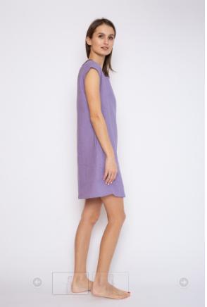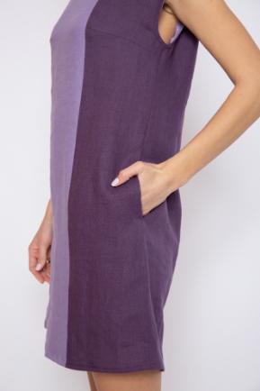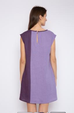 Hihaton pellavakankainen tunikamekko. Sen pääntien huoliteltu kauniisti korostaen erivärisellä terenauhalla. Hihattoman tunikamekon olkapää jatkuu ns. holkkihihaksi.Yläosastaan muotoonommeltu ja päällelaittoa helpottaa takana niskassa oleva yhden napin kiinnitys. Tunikamekko on linjastoltaan kevyesti A-linjainen, helppo ja huoleton.