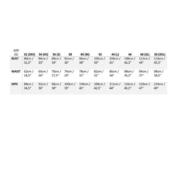 Tunikan koko täsmää hyvin suomalaiseen mitoitukseen. Oman kokosi tarkastat helposti vertaamalla mittojasi mittataulukon mittoihin.