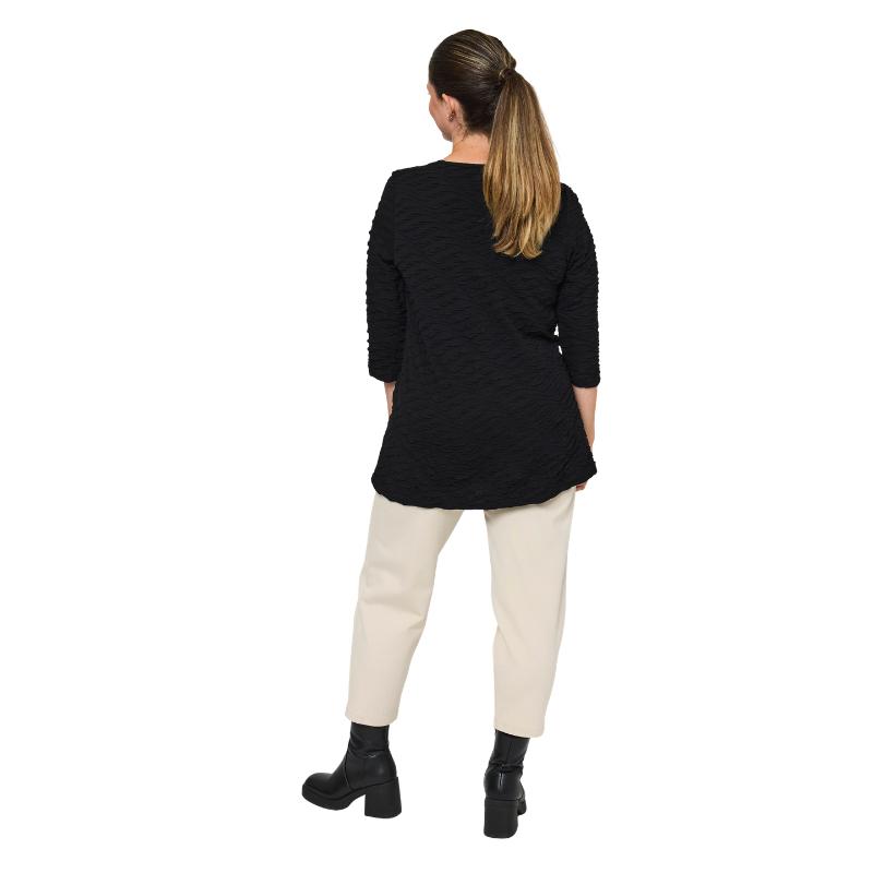 Musta A-linjainen tunika 3/4-hihoilla ja kauniilla eläväpintaisella struktuurilla. Selän pituus koossa M 76 cm. Sopii arkeen, töihin ja juhlavampiinkin hetkiin.