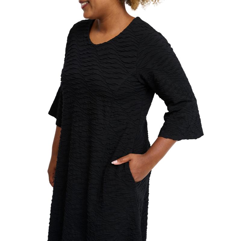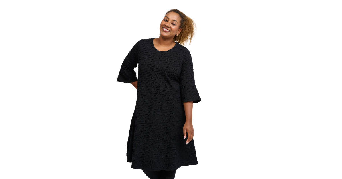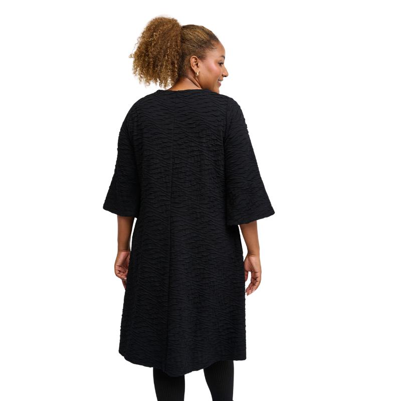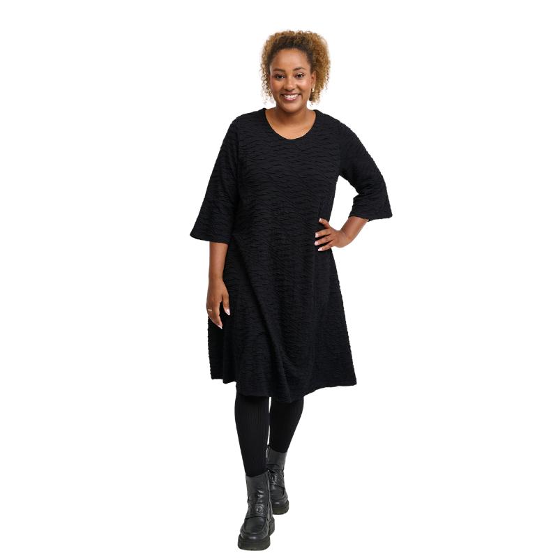 Väljä, kauniisti laskeutuva malli tuntuu mukavalta päällä ja antaa tilaa liikkua. 3/4-hihat tuovat ryhtiä ja tekevät mekosta huolitellun niin surujuhlaan kuin muihinkin arvokkaisiin tilaisuuksiin.