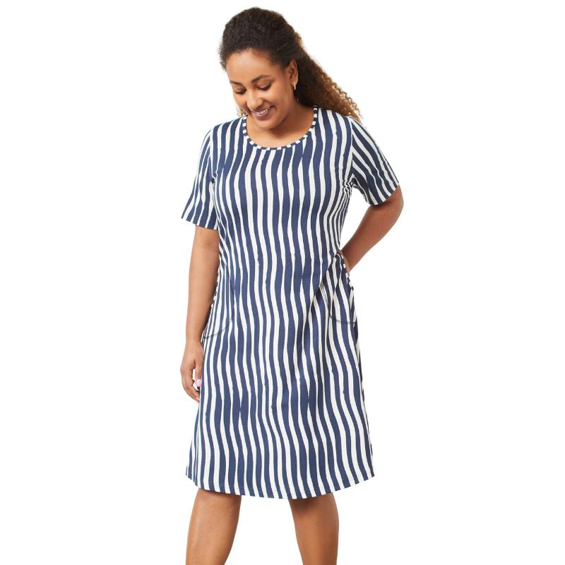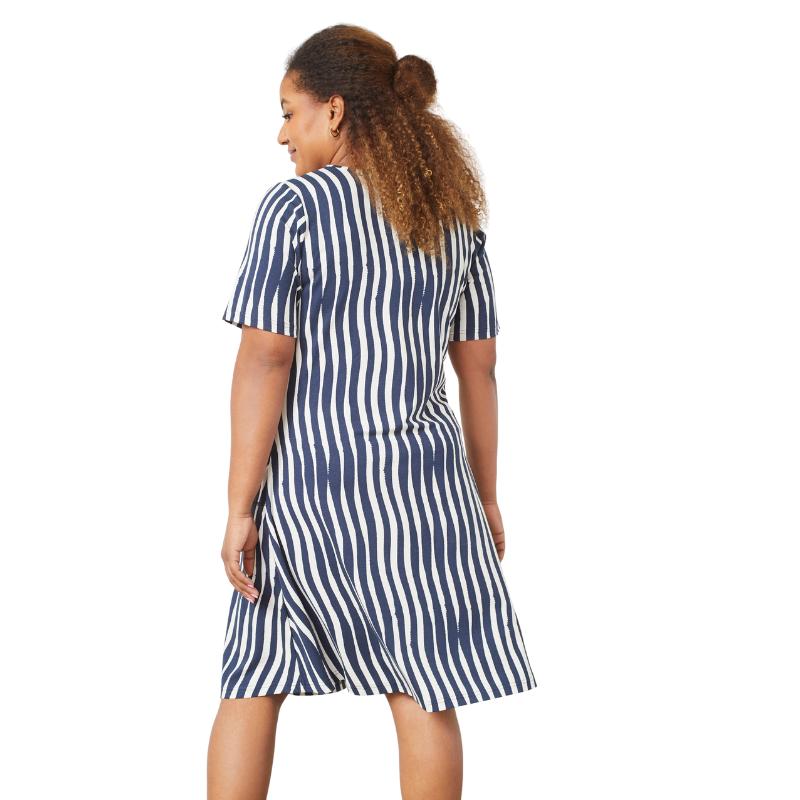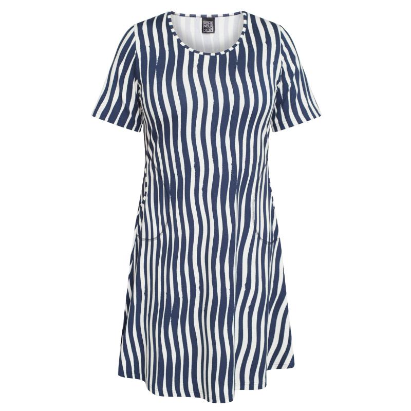 Pont Neuf:n Maica on ajattoman tyylikäs ja ihanan mukava mekko, jossa yhdistyvät keveys, naisellinen A-linja ja klassinen raitakuosi. Mekon pystysuorat raidat luovat hoikentavan vaikutelman, ja joustava viskoosisekoite tuntuu pehmeältä ihoa vasten.