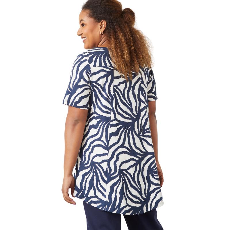 Pyöreä pääntie ja epäsymmetrisesti kaartuva helma, joka ulottuu 75 cm etupuolelta ja 80 cm takaa, tuovat liikkeeseen keveyttä ja eleganttia virtaavuutta.