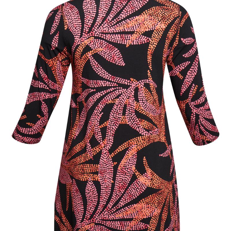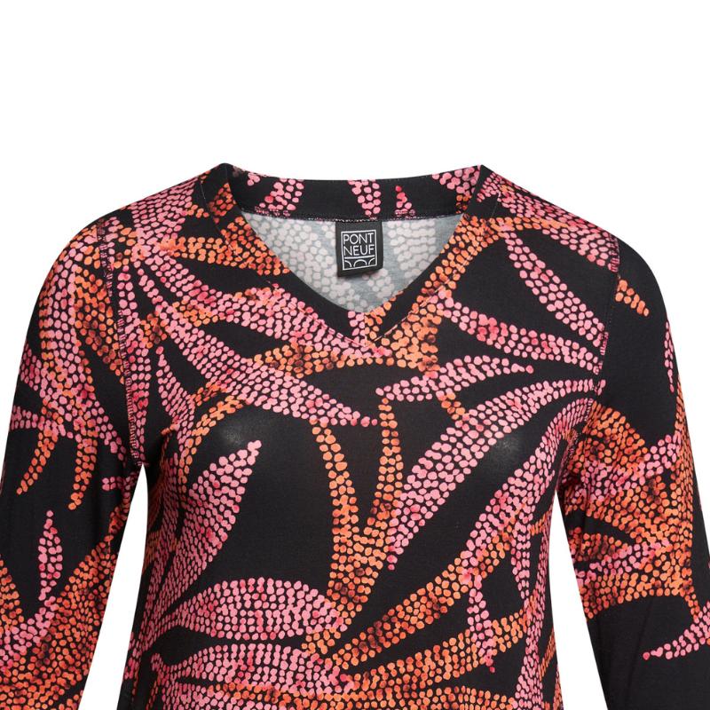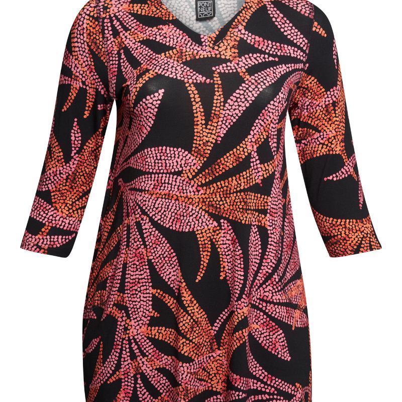 Tämä Pont Neufin eläväpintainen kuositunika on kuin pieni väriloiste, joka kulkee mukanasi koko päivän. Pinkin ja oranssin sävyissä hehkuva kuvio herättää asun eloon, mutta pehmeä, hyvin laskeutuva materiaali tuo siihen juuri sopivasti rauhallista ryhtiä. V-pääntie ja kauniisti istuvat hihat luovat naisellisen, rennon kokonaisuuden, joka sopii yhtä hyvin arjen menoon kuin illan rennompiin kohtaamisiin.