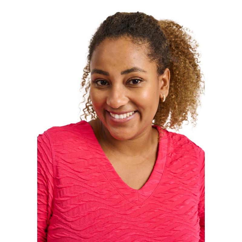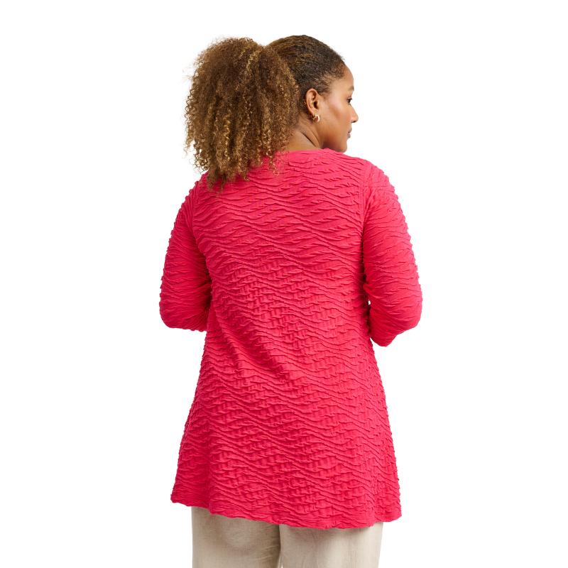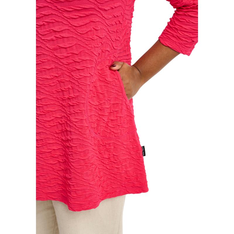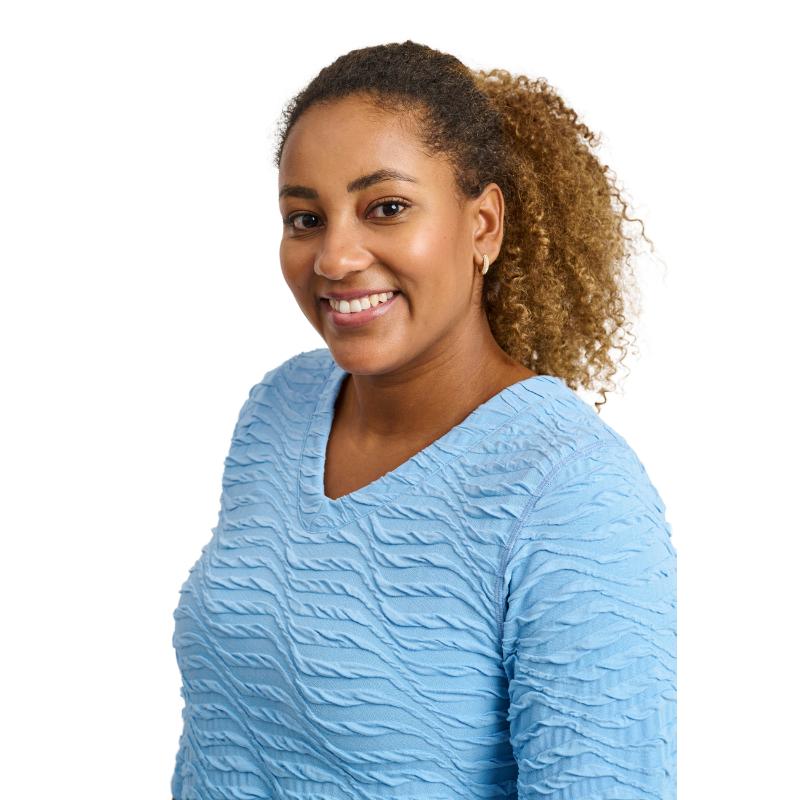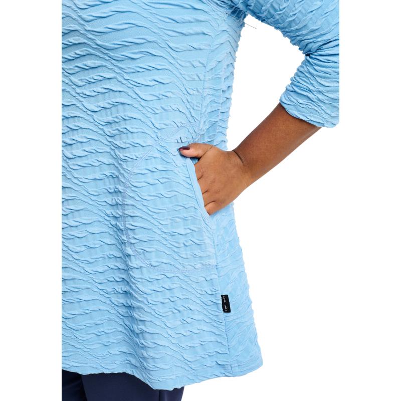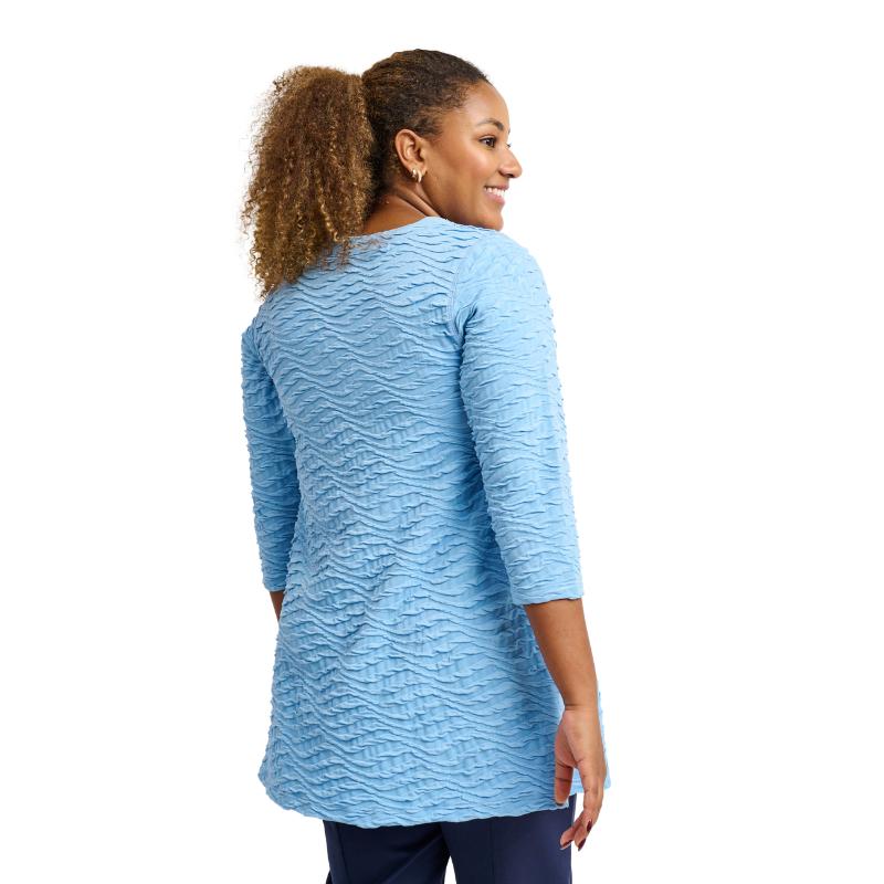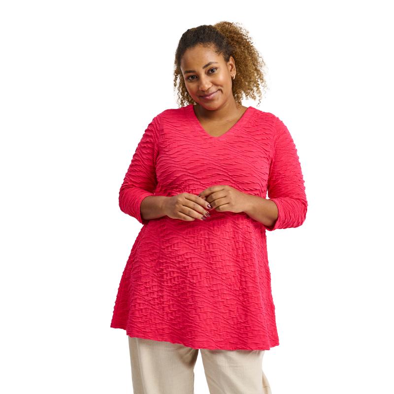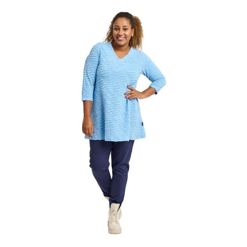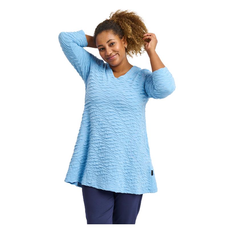 Tämä A-linjainen tunika on täydellisen naisellinen ja laadukas valinta. Sen kevyt ja joustava materiaali myötäilee vartaloa kauniisti, tarjoten samalla pitkäkestoista mukavuutta koko päivän ajan. Hienovarainen kuviointi ja kolmen neljänneksen hihat tuovat herkkää ja modernia ilmettä, kun taas pyöristetty helma antaa asulle viimeistellyn ja elegantin ilmeen.