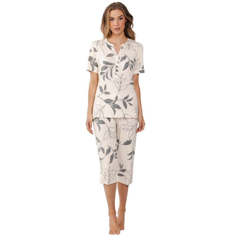 Caprimittaiset housut ja lyhythihainen paita tarjoavat täydellisen yhdistelmän mukavuutta ja liikkumavapautta, tehden tästä setistä ihanteellisen valinnan niin kesäöihin kuin ympäri vuoden käytettäväksi. Hillitty ja ajaton kuviointi luonnonvalkoisella pohjalla korostaa naisellista eleganssia hienovaraisella tavalla.