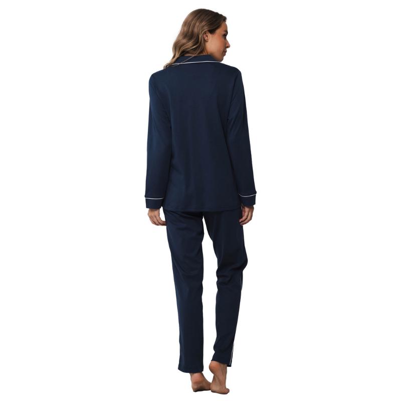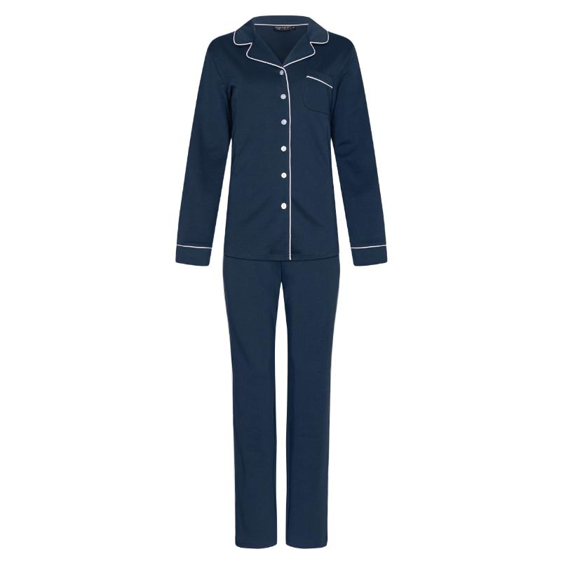 Nauti mukavuudesta ja tyylikkyydestä tällä laadukkaalla naisten trikoopyjamalla. Pehmeä ja joustava materiaali tuntuu miellyttävältä iholla ja tarjoaa täydellisen istuvuuden. Pyjama koostuu pitkälahkeisista housuista sekä napitettavasta paidasta, joka tuo klassista charmia ilmeeseen.