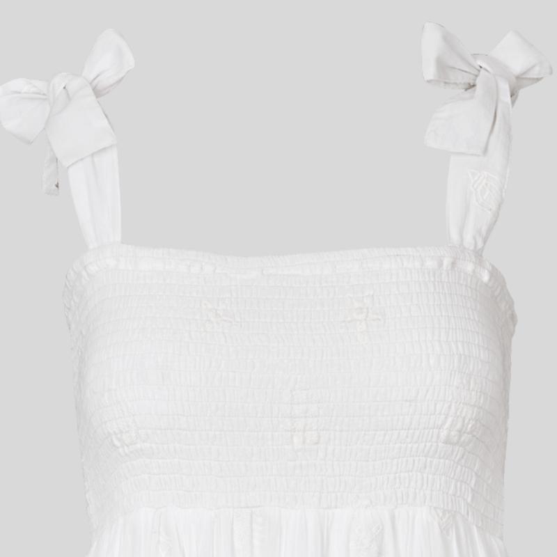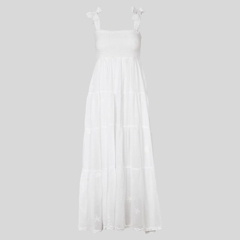 Maksimekko kuin höyhen. Ohut ilmava valkoinen puuvilla kirjailtuna pienillä meren aarteilla, simpukuilla ja meritähdillä. Mekko on rakkautta ensisilmäyksellä. Mekossa on ohut vuori, joten alusvaatteet jäävät mukavasti näkymättömiin. Pue tämä valloittava höyhenen henkäys lämpimänä kesäpäivänä ja tunnet olosi mukavaksi ja viileäksi. Mekko on rento ja löysä, mutta istuu hyvin olkapäistä ja rinnasta. Väljä leikkaus antaa ilmavuutta, jolloin ilmavirta liikkuu vapaasti ihoa vasten. Asusteilla, IKAT-topilla esimerkiksi, sinun on helppo korostaa mekon keveyttä ja samalla suojata olkapäitä ja hartioita.