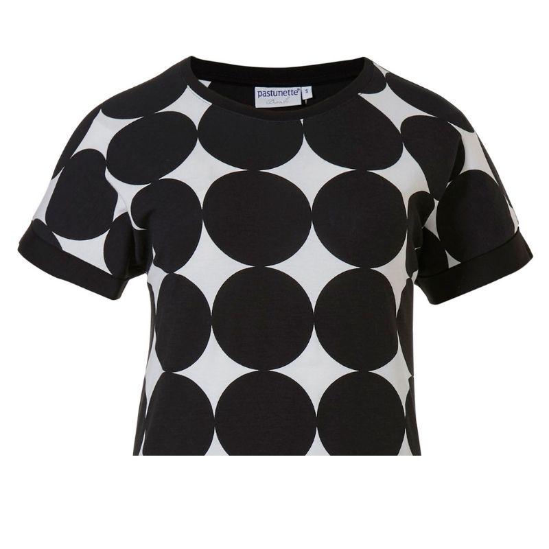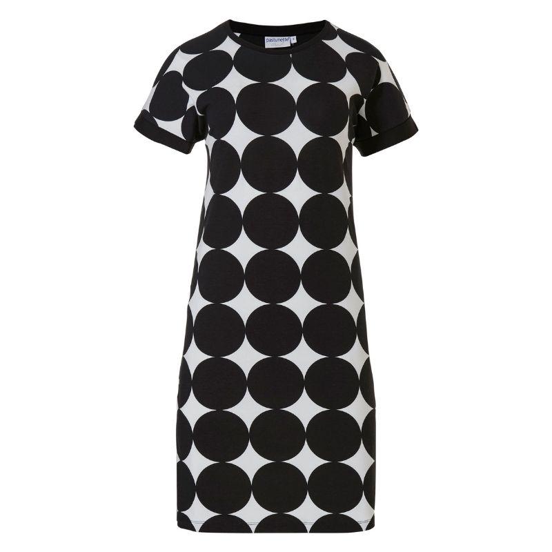 Laskeutuva, ihana, vilpoinen, lyhyt hihainen mekko, on viskoositrikoota. Mustavalkopallollinen viskoositrikoo on helppohoitoinen ja sopii moneen hetkeen käytettäväksi. Rantamekon pituus on 95cm. Mekko sujahtaa kivasti päällä ja on pehmeä käyttövaate.